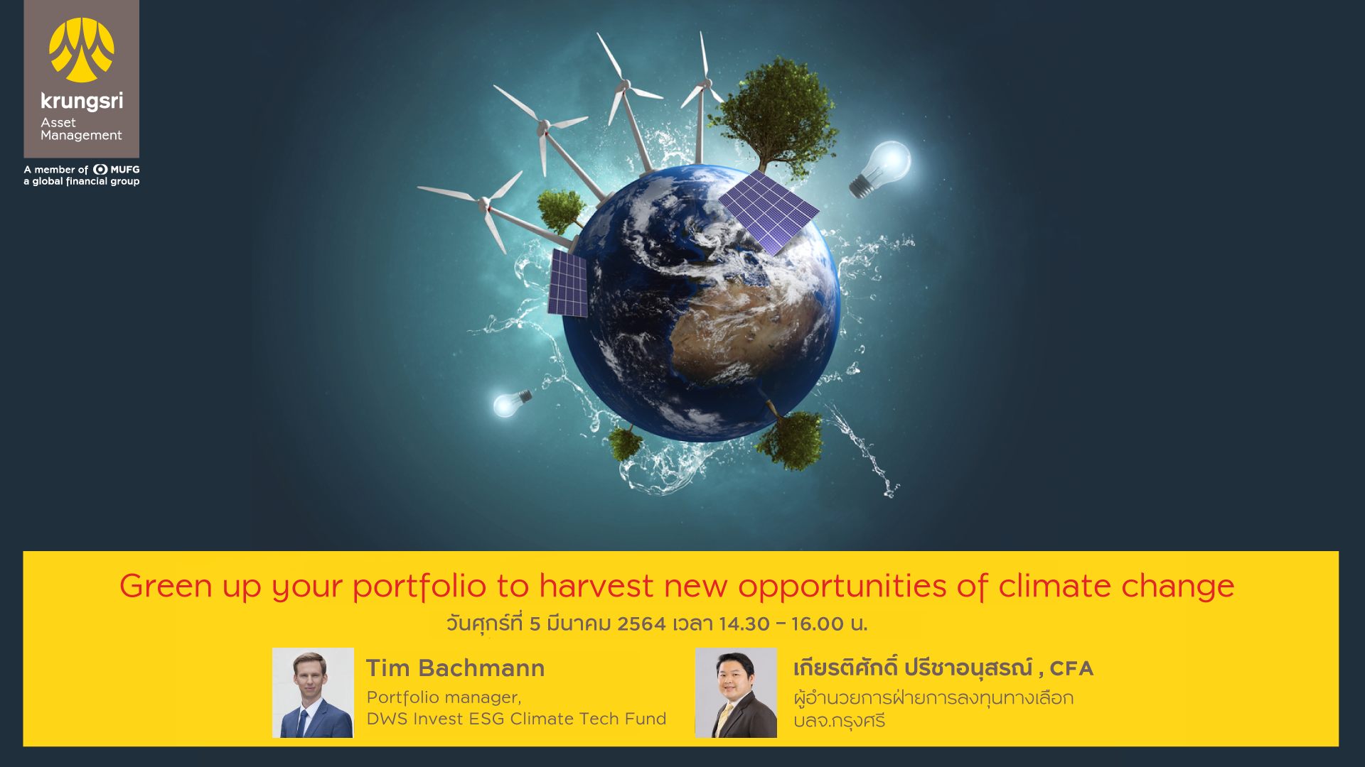 ทำให้เกิดธุรกิจที่เป็นผู้ชนะ ได้รับประโยชน์จากการฟื้นฟูสภาพอากาศ และมีศักยภาพเติบโตในอนาคต ค้นหาโอกาสลงทุนในหุ้นกรีนและเทคโนโลยีรักษ์โลก เพื่อเป้าหมายทั้งผลตอบแทนดีๆ และโลกที่น่าอยู่ขึ้น จาก DWS Invest ESG Climate Tech Fund ผู้บริหารกองทุนหลักของ KFCLIMA-A และผู้จัดการกองทุนของ บลจ.กรุงศรี