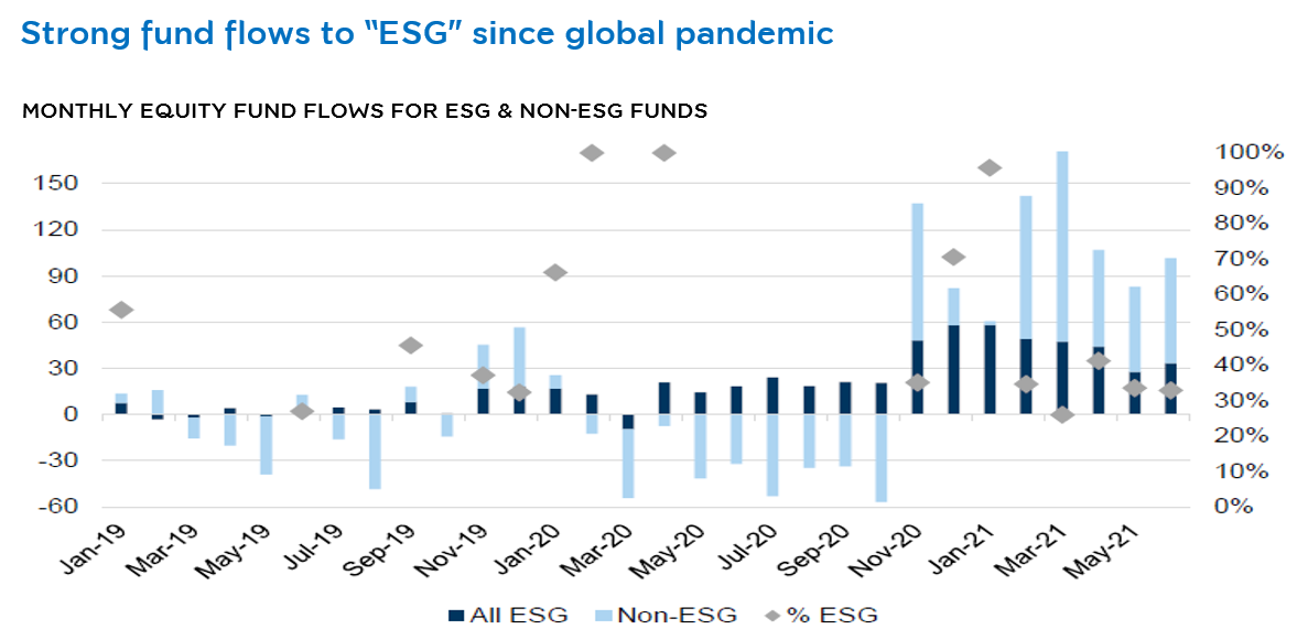 นับตั้งแต่เกิดการแพร่ระบาดของไวรัสโคโรน่าตั้งแต่ไตรมาส 2 ปี 2563 เป็นต้นมา ทำให้ธุรกิจที่มีแนวคิดด้าน ESG และมีนวัตกรรมช่วยแก้ไขปัญหาดังกล่าวได้รับความสนใจจากนักลงทุนอย่างต่อเนื่อง ทำให้มีอัตราการเติบโตเพิ่มขึ้นอย่างเห็นได้ชัด โดยหากนับตั้งแต่เกิดการแพร่ระบาดของโควิด กองทุนหลักสามารถสร้างผลตอบแทนได้สูงถึง 58% โดยมีสถานการณ์โควิดเป็นปัจจัยเร่งที่ทำให้นักลงทุนให้ความสำคัญกับ ESG เพิ่มมากขึ้น สำหรับในปีนี้ กองทุนหลัก สามารถสร้างผลตอบแทนได้มากกว่า 15% แล้ว สูงกว่ากองทุนหุ้นทั่วโลกที่สร้างผลตอบแทนได้เพียง 13% และด้วยกระแสเงินทุนที่ยังคงไหลเข้ากองทุนหุ้น ESG อย่างต่อเนื่อง ทำให้เป็นเวลาที่เหมาะสมที่จะเข้าลงทุนในธุรกิจตามแนวคิด ESG เพื่อกระจายความเสี่ยงในการลงทุนท่ามกลางสภาวะตลาดที่ยังมีความผันผวน