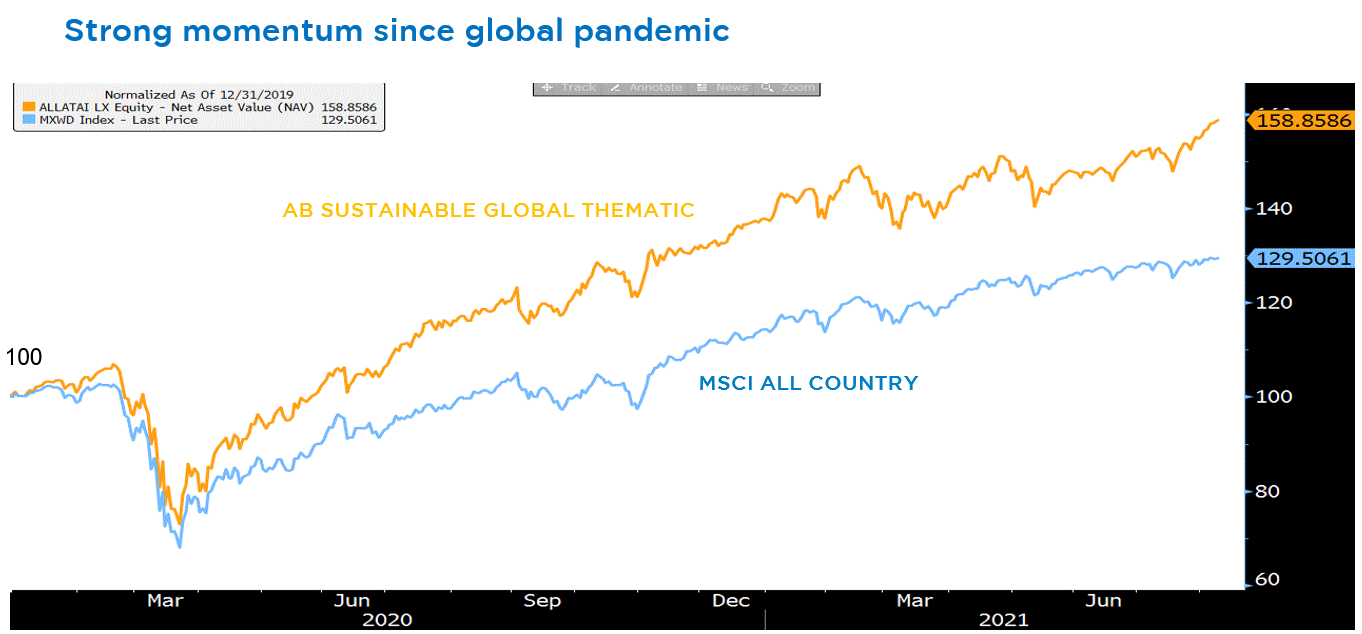 ด้านคุณ David Wong กล่าวว่า AB Sustainable Global Thematic Portfolio Fund เป็นกองทุนระดับโลกที่มีความเชี่ยวชาญการลงทุนในธุรกิจที่ก่อให้เกิดผลเชิงบวกต่อสภาพแวดล้อมและสังคม โดยเป้าหมายของกองทุนคือการสร้างผลตอบแทนที่เหนือกว่าดัชนีหุ้นโลก ทั้งนี้ กองทุนได้นำเอาแนวคิดด้าน ESG มาใช้เป็นแนวทางและเป็นส่วนหนึ่งของกระบวนการลงทุน