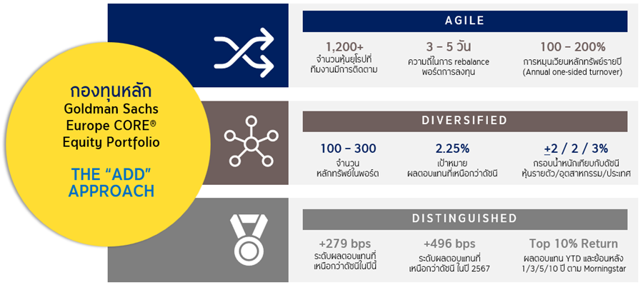 - กองทุนหลักใหม่ Goldman Sachs Europe CORE® Equity Fund ใช้แนวทางกระจายการลงทุนมากขึ้น โดยมีการลงทุนในกว่า 174 หลักทรัพย์ ครอบคลุมหลายอุตสาหกรรมและประเทศ ใช้กลยุทธ์การลงทุนผสมสานระหว่างหุ้น Growth และ Value เพื่อปรับตัวตามวัฏจักรตลาดยุโรป เพิ่มความยืดหยุ่นและความทนทานของพอร์ต