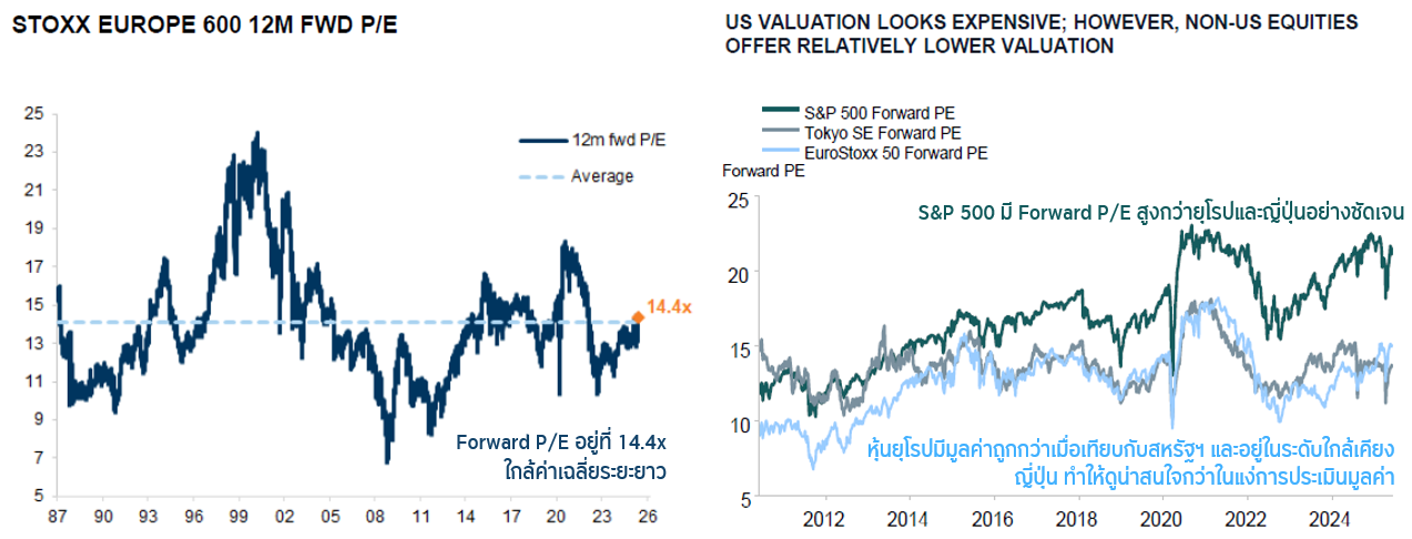 - การใช้จ่ายของภาครัฐในด้านกลาโหม โครงสร้างพื้นฐานและพลังงานสะอาดจะเป็นแรงหนุนเพิ่มเติม ขณะที่ตลาดยุโรปมีความสมดุลระหว่างหุ้นเติบโต (Growth) และหุ้นคุณค่า (Value) ซึ่งต่างจากตลาดสหรัฐฯ ที่เน้นหุ้นเติบโตมากกว่า