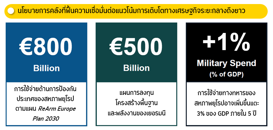 - ท่ามกลางความท้าทายทางภูมิรัฐศาสตร์และการเติบโตที่แตกต่างกันภายในภูมิภาค รวมถึงมาตรการเชิงโครงสร้าง เช่น ReArm Europe Plan 2030 ของสหภาพยุโรป การลงทุนโครงสร้างพื้นฐานและพลังงานของเยอรมนี และงบประมาณด้านกลาโหมของยุโรป จะช่วยสนับสนุนการเติบโตของ GDP ในระยะกลางถึงยาว