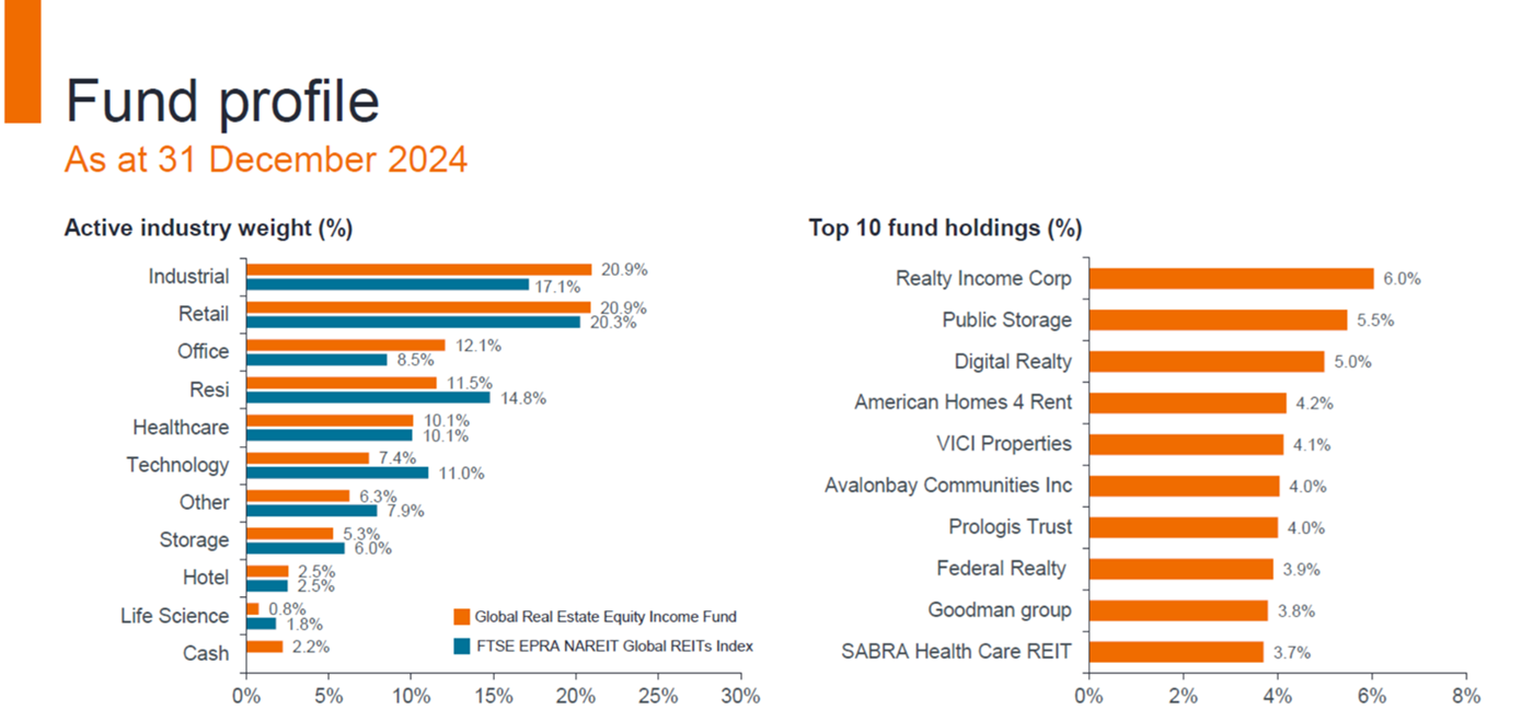 - กองทุนมุ่งเน้นการลงทุนในธุรกิจอสังหาริมทรัพย์ระดับโลกที่มีคุณภาพสูงและกองทุน REITs ซึ่งมีสิทธิ์ในการถือครองทรัพย์สินมากกว่า สามารถบริหารจัดการทรัพย์สินได้โดยตรง และยังได้รับประโยชน์จากต้นทุนทางการเงินที่ต่ำกว่า รวมถึงการเข้าถึงแหล่งเงินทุนที่ง่ายกว่าผู้ถือครองอสังหาริมทรัพย์ประเภทอื่นๆ