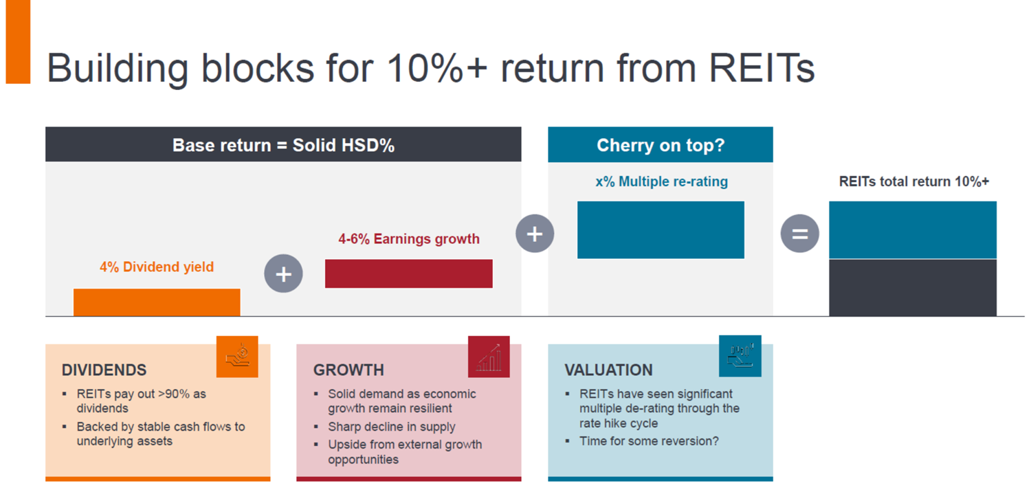 - แนวคิดและกลยุทธ์ในการลงทุนคือสินทรัพย์ที่มีโอกาสเติบโตสูงในอนาคต มีความได้เปรียบในการแข่งขัน สอดคล้องกับเทรนด์ความต้องการของผู้บริโภคที่กำลังเปลี่ยนแปลงเข้าสู่ยุคดิจิทัล วิถีชีวิตที่ต้องการความสะดวกสบาย การเปลี่ยนแปลงของโครงสร้างประชากร และความยั่งยืน ธีมการลงทุนและภาคธุรกิจที่มีโอกาสเติบโตได้แก่ โลจิสติกส์ เทคโนโลยีด้านอสังหา และ Healthcare ที่มีราคาน่าสนใจ