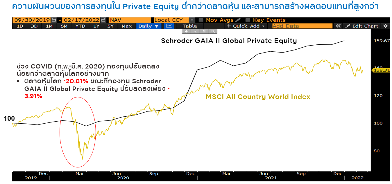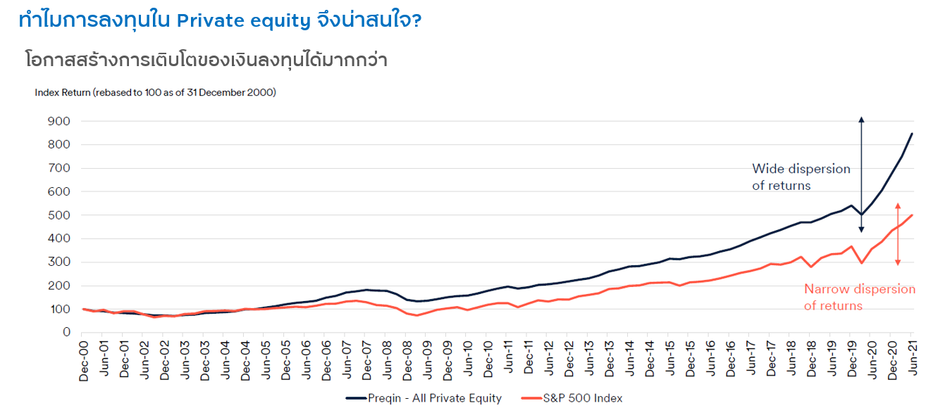 โดยปกติแล้ว การลงทุนใน Private Equity จะสามารถสร้างผลตอบแทนที่แตกต่างอย่างมีนัยสำคัญหากมีการเฟ้นหาและคัดเลือกบริษัทที่จะลงทุนได้เป็นอย่างดี ตัวอย่างเช่น โดยสถิติที่ผ่านมา การลงทุนใน Private Equity หากเริ่มต้นลงทุนในปี 2000 มาจนถึงปัจจุบันจะสามารถสร้างผลตอบแทนได้ถึง 8 เท่า ขณะที่การลงทุนในตลาดทุนเมื่อเทียบกับดัชนี S&P500 มีผลตอบแทนอยู่ที่ 4 เท่า ขณะที่ความผันผวนของการลงทุนใน Private Equity จะต่ำกว่าการลงทุนในตลาดหุ้น เช่น ในช่วงวิกฤติการแพร่ระบาดของโควิดที่ส่งผลกระทบต่อตลาดหุ้นเป็นอย่างมากนั้น แต่การลงทุนใน Private Equity กลับได้รับผลกระทบเพียงเล็กน้อย