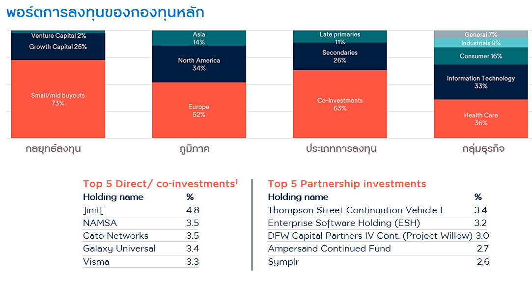 ทั้งนี้ กองทุนยังเน้นการลงทุนแบบกระจายความเสี่ยงโดยกระจายการลงทุนไปในหลากหลายอุตสาหกรรม โดยภาคธุรกิจที่กองทุนให้ความสนใจได้แก่ ธุรกิจด้านสุขภาพ เทคโนโลยี ธุรกิจที่เกี่ยวข้องกับการบริโภค การให้บริการเชิงธุรกิจ และภาคอุตสาหกรรมต่างๆ พอร์ตของกองทุนในปัจจุบัน มีสัดส่วนการลงทุนแบบ Buyout อยู่ที่ประมาณ 73% และแบบ Growth 25% และอีก 2% ลงทุนแบบ Venture ในธุรกิจขนาดเล็กหรือสตาร์ตอัพที่เพิ่งเริ่มต้น ถ้าแบ่งสัดส่วนการลงทุนตามภูมิภาค กว่า 80% อยู่ในยุโรปและสหรัฐอเมริกา ส่วนที่เหลืออยู่ในภูมิภาคเอเชีย ทั้งนี้ จะเน้นการลงทุนแบบ Co-Investment ในบริษัทที่มีศักยภาพและกองทุนสามารถร่วมพัฒนาเพิ่มคุณค่าให้ธุรกิจได้ เช่น เข้าไปร่วมลงทุนในบริษัท Pete & Gerry’s ผู้เชี่ยวชาญการผลิตไข่ไก่ออร์แกนิคในสหรัฐอเมริกา และบริษัท ]init[ ของเยอรมันที่ให้บริการด้านการใช้เทคโนโลยีเพื่อเปลี่ยนแปลงธุรกิจ เป็นต้น