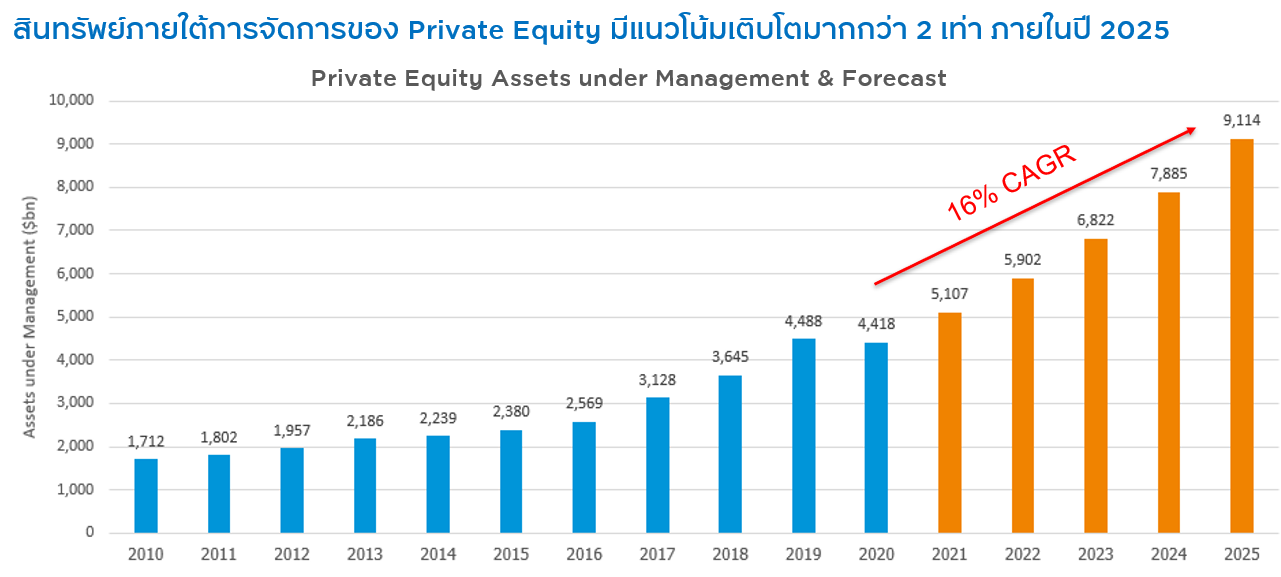 คุณพรชนก กล่าวเพิ่มเติมว่า Private Equity กำลังเป็นสินทรัพย์ทางเลือกที่นักลงทุนให้ความสนใจมากขึ้นเรื่อยๆ และมีแนวโน้มว่าจะมีเม็ดเงินลงทุนไหลเข้ามากที่สุด โดยเฉพาะในเวลานี้ที่ตลาดหุ้นมีความผันผวนอย่างมาก ทั้งนี้ มีการคาดการณ์ว่า Private Equity สามารถเติบโตได้ถึง 16% ต่อปี หรือเติบโตขึ้นเป็นสองเท่าในปี 2025