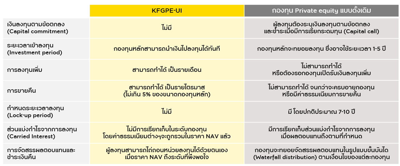 สำหรับกองทุน KFGPE-UI ที่มี Schroder GAIA II Global Private Equity Fund เป็นกองทุนหลักนี้ จะมีความแตกต่างจากกองทุน Private Equity แบบดั้งเดิมทั่วไปอยู่หลายประการ กล่าวคือ จะไม่มีการกำหนดเงินลงทุนตามข้อตกลง (capital commitment) สามารถลงทุนเพิ่มได้เป็นรายเดือนและสามารถขายคืนได้เป็นรายไตรมาส ขณะที่กองทั่วไปส่วนใหญ่จะมีกำหนดระยะเวลาการลงทุนและไม่สามารถขายคืนได้ก่อนกำหนด นอกจากนี้ กองทุนหลักของ KFGPE-UI ยังไม่มีการเรียกเก็บส่วนแบ่งกำไรจากการลงทุน (Carried interest) เนื่องจากค่าธรรมเนียมต่างๆ จะถูกรวมในราคา NAV แล้ว โดยผู้ลงทุนสามารถไถ่ถอนหน่วยลงทุนได้ด้วยตนเองเมื่อราคา NAV ถึงระดับที่พึงพอใจ จึงเป็นเงื่อนไขการลงทุนที่ยืดหยุ่นมากกว่ากองทุน Private Equity แบบดั้งเดิม เพิ่มความน่าสนใจในการลงทุนมากยิ่งขึ้น