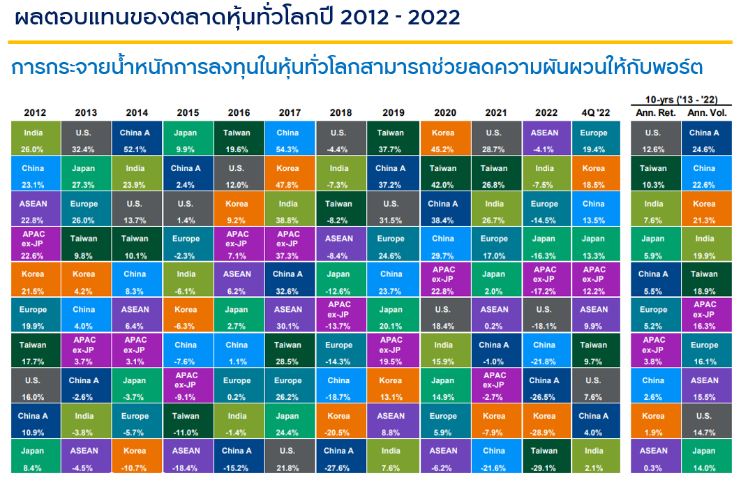 ตลาดหุ้นทั่วโลกปรับตัวแตกต่างกัน ขึ้นอยู่กับการเติบโตและปัจจัยทางเศรษฐกิจของแต่ละประเทศเอง การกระจายการลงทุนผ่านกองทุนที่ลงทุนในตลาดหุ้นที่แตกต่างกัน หลากหลายภูมิภาค จึงเป็นกลยุทธ์การลงทุนที่สามารถช่วยลดความผันผวนให้กับพอร์ตได้
