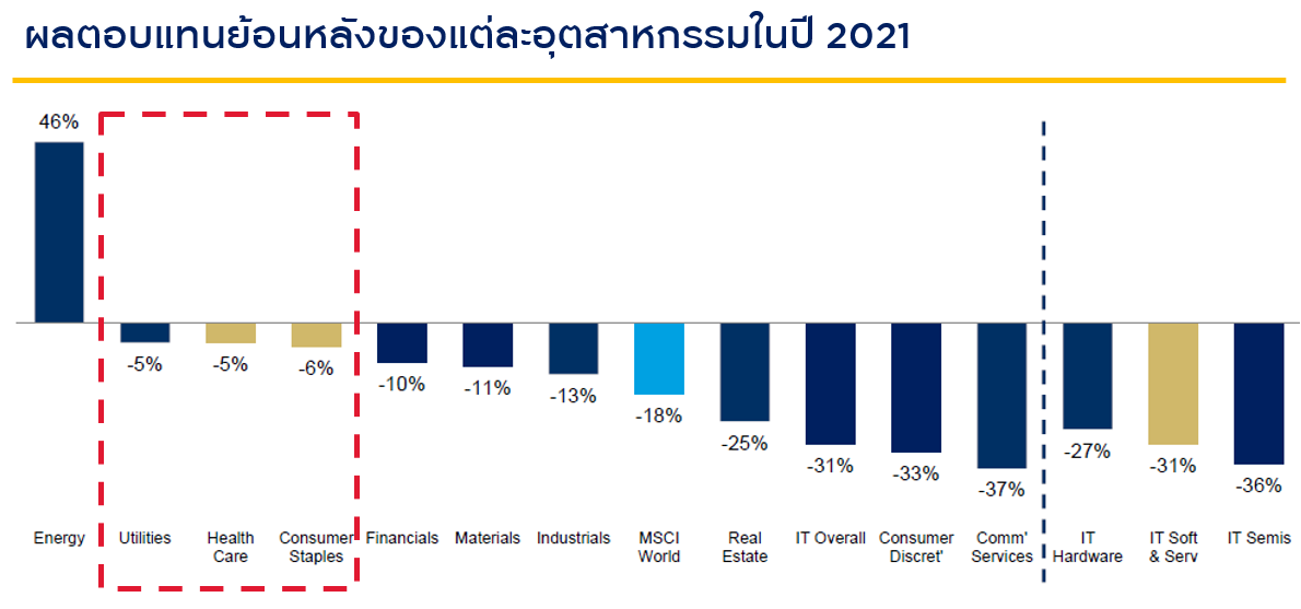 ซึ่งส่งผลต่อระดับราคาและผลตอบแทนที่แตกต่างกันในแต่ละช่วงเวลา กลุ่มธุรกิจเชิงรับจะมีการปรับตัวและสามารถทนทานต่อการปรับตัวลดลงได้ดีกว่า ได้แก่ กลุ่มสาธารณูปโภค สุขภาพ และสินค้าจำเป็นในชีวิตประจำวัน ที่มา: FactSet, MSCI, Standard & Poor’s, J.P. Morgan Asset Management ณ 31 ธ.ค. 65