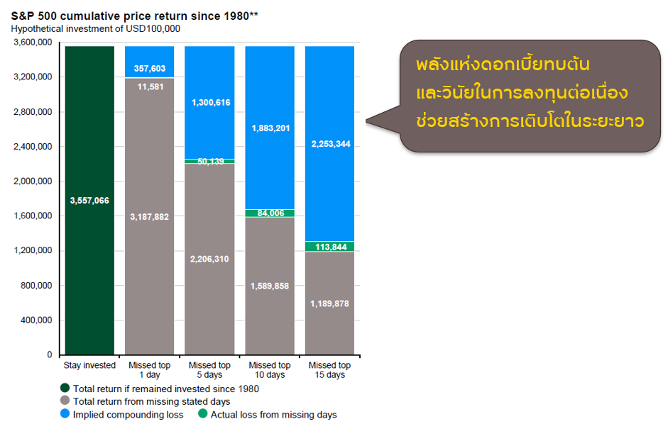 จากภาพของผลตอบแทนดัชนี S&P 500 จากเงินลงทุน 100,000 USD จะเห็นว่าหากถือการลงทุนต่อเนื่องตั้งแต่ปี 1980 พลังแห่งการทบต้นจะส่งผลให้เงินลงทุนโดยรวมเติบโตได้มากกว่าการพยายามหาจังหวะการซื้อ/ขาย ซึ่งอาจทำให้พลาดการลงทุนในวันที่ดัชนีปรับตัวเพิ่มขึ้นสูงสุด แลำทำให้เงินลงทุนเติบโตได้น้อยกว่าในระยะยาว ที่มา: Standard & Poor’s, FactSet, MSCI, J.P. Morgan Asset Management ณ 31 ธ.ค. 65