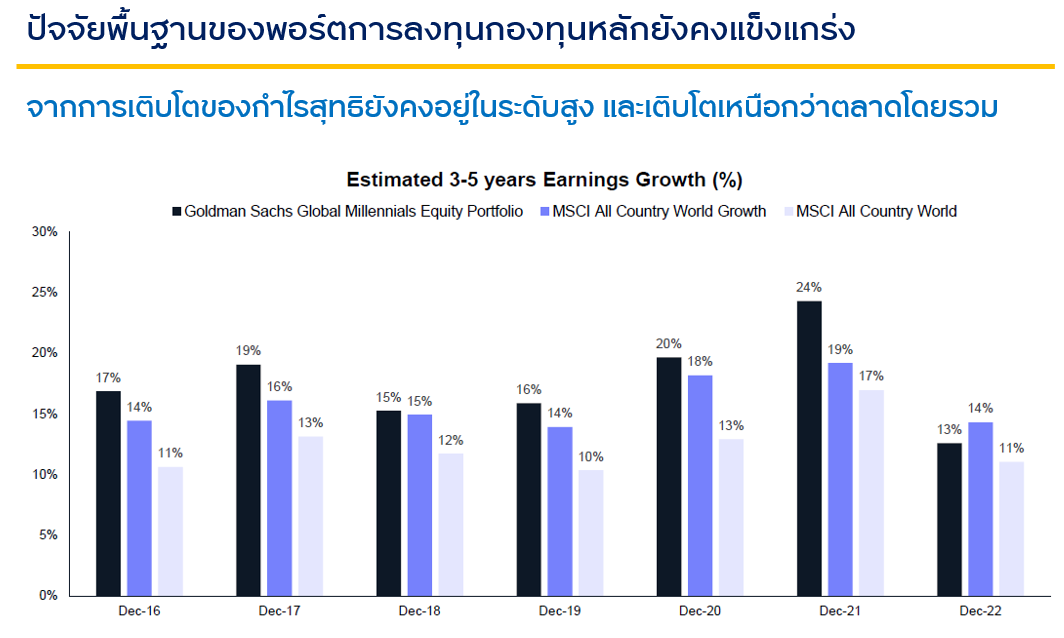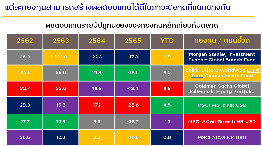 1. ผลการดำเนินงานที่แข็งแกร่งของกองทุนหลักกองทุนหลักของทั้งสามกองทุนก็สามารถสร้างผลตอบแทนได้ดีในแต่ละช่วงเวลาและภาวะตลาดที่ต่างกัน ที่มา: Morningstar ณ 28 ก.พ. 66 | ผลการดำเนินงานที่แสดงเป็นผลการดำเนินงานของกองทุนหลัก ซึ่งไม่ได้เป็นไปตามมาตรฐานการวัดผลการดำเนินงานของกองทุนรวมของ AIMC | ผลตอบแทนแสดงในรูปสกุลเงิน USD โดยเป็นผลตอบแทนสะสมรายวัน | ดัชนีอ้างอิงของกองทุน Morgan Stanley Investment Funds – Global Brands Fund คือ MSCI World NR USD | ดัชนีอ้างอิงของกองทุน Baillie Gifford Worldwide Long Term Global Growth Fund คือ MSCI ACWI NR USD | ดัชนีอ้างอิงของกองทุน Goldman Sachs Global Millennials Equity Portfolio คือ MSCI ACWI Growth NR USD