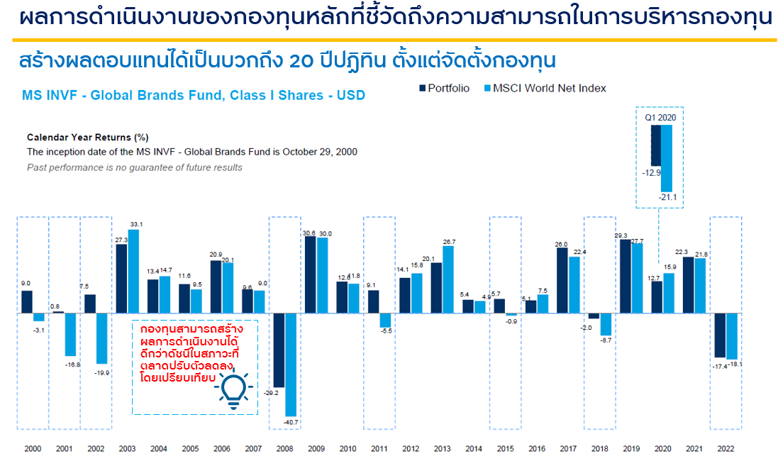 ที่มา: Morgan Stanley Investment Management ณ ธ.ค. 65 | ผลการดำเนินงานที่แสดงเป็นผลการดำเนินงานของกองทุน Morgan Stanley Investment Funds - Global Brands Fund คลาส I ซึ่งเป็นคลาสที่จัดตั้งมายาวนานที่สุด โดยจัดตั้งเมื่อวันที่ 29 ต.ค. 43 ในขณะที่กองทุน KFGBRAND จะลงทุนในคลาส Z ซึ่งจัดตั้งขึ้นในวันที่ 10 มิ.ย. 51 | ผลการดำเนินงานที่แสดงเป็นผลการดำเนินงานหลังหักค่าธรรมเนียมการจัดการ และคิดเป็นรูปสกุลเงิน USD | ผลการดำเนินงานที่แสดงเป็นผลการดำเนินงานของกองทุนหลัก ซึ่งไม่ได้เป็นไปตามมาตรฐานการวัดผลการดำเนินงานของกองทุนรวมของสมาคมบริษัทจัดการลงทุน | ผลตอบที่จะไม่ถูกคำนวณเป็นร้อยละต่อปีกรณีที่ช่วงเวลาน้อยกว่า 1 ปี | เงินปันผลและรายได้ทั้งหมดถูกนำกลับเข้ามาลงทุนเพื่อคำนวณผลตอบแทนข้อมูลกองทุน คลิก: KFGBRAND-A | KFGBRAND-D | KFGBRAND-I