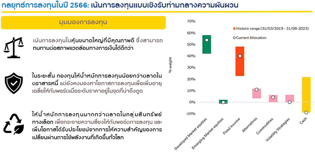 ในอดีตที่ผ่านมา พอร์ตของกองทุนมีสัดส่วนการลงทุนในหุ้นอยู่ 40 - 65% ซึ่งกองทุนจะเน้นลงทุนในหุ้นขนาดใหญ่เป็นหลักเพื่อป้องกันความเสี่ยง และจะคัดเลือกเฉพาะบริษัทที่ใช้หลักการ ESG ในการดำเนินงานเพื่อการเติบโตอย่างยั่งยืนในระยะยาว สำหรับตราสารหนี้มีสัดส่วนอยู่ที่ 20 - 40% ผู้เชียวชาญกล่าวว่าในช่วงนี้ กองทุนจะเพิ่มน้ำหนักการลงทุนในตราสารหนี้ภาครัฐ และตราสารหนี้ภาคเอกชนระดับ Investment Grade คุณภาพสูง เนื่องจากเป็นสินทรัพย์ที่จะทำผลตอบแทนได้ดีในช่วงที่ดอกเบี้ยสูงและกลยุทธ์ของกองทุนคือเน้นถือตราสารหนี้ที่มีอายุยาวๆ เป็นการล็อคผลตอบแทนที่ดีในระยะยาวและเมื่ออัตราดอกเบี้ยลดลงผลตอบแทนของตราสารหนี้ก็จะเพิ่มมากขึ้น ทำให้มีโอกาสที่จะได้ Capital Gain เพิ่มขึ้นอีกด้วย สำหรับสินทรัพย์ทางเลือกอย่างเช่น REIT ซึ่งราคาลดลงมามากๆมีโอกาสที่จะกลับไปสู่ราคาค่าเฉลี่ยได้ กองทุนก็ให้ความสนใจ