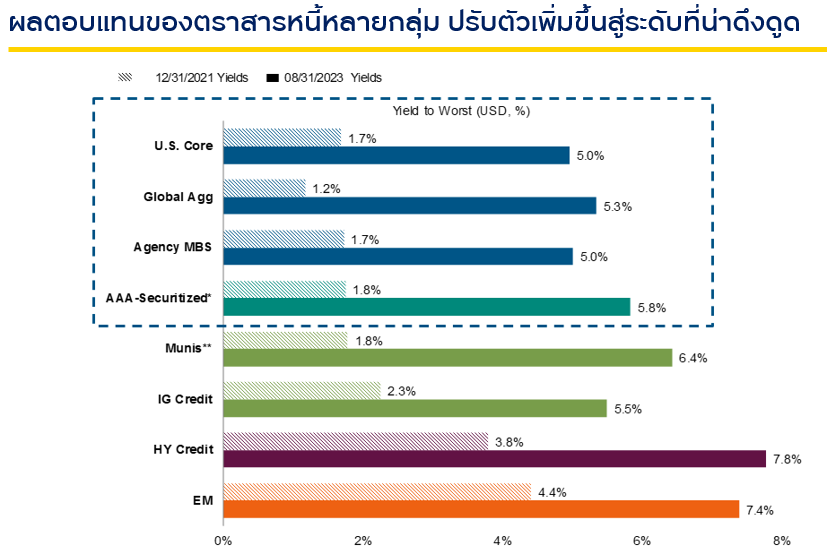 สำหรับกลยุทธ์ในการลงทุนตราสารหนี้ PIMCO จะคัดเลือกสินทรัพย์ที่จะเข้าลงทุน โดยพิจารณาจากสภาวะตลาดและการลงทุน ซึ่งในปัจจุบันนี้ที่อัตราดอกเบี้ยนโยบายอยู่ในระดับสูง ทำให้กองทุนจะพิจารณาลงทุนในตราสารที่มีอายุยาวๆ เพื่อล็อคผลตอบแทนไว้ในระยะยาว ทั้งนี้ PIMCO ยังมองว่าตราสารหนี้ที่น่าสนใจในขณะนี้ ได้แก่ Agency- Mortgage Back Securities (MBS) ซึ่งเป็นตราสารทางการเงินอย่างหนึ่งที่มีการรับประกันโดยรัฐบาล โดย PIMCO เชื่อว่าจะเป็นจะตราสารหนี้คุณภาพสูงที่ค่อนข้างปลอดภัย มีความเสี่ยงต่ำ และยังอยู่ในระดับราคาที่ถูก เหมาะสมต่อการลงทุน ที่มา: Bloomberg, PIMCO ณ 31 ส.ค. 66 | ดัชนีที่เป็นตัวแทนอ้างอิงในแต่ละกลุ่ม: Agency MBS: Bloomberg MBS Fixed Rate Index, Munis: Bloomberg Municipal Bond Index, U.S. Core: Bloomberg U.S. Aggregate, Global Agg: Bloomberg Global Aggregate USD Hedged, HY Credit: ICE BofAUS HY BB-B Rated Index, EM: JPMorgan EMBI Global USD Hedged, IG Credit: Bloomberg US Credit Index. * AAA-Securitized YTW คำนวณจากค่าเฉลี่ยของ AAA CLOs, CMBS และ ABS จาก JPMorgan และ Barclays. Municipal yields เป็นอัตราผลตอบแทนหลังภาษี โดยอ้างอิงจากอัตราภาษีที่สูงที่สุดที่ 40.8%. Unadjusted IG Muni index yield คือ 3.81% ซึ่งมีการเปลี่ยนแปลง 275bps เมื่อเทียบกับ 31 ธ.ค. 64