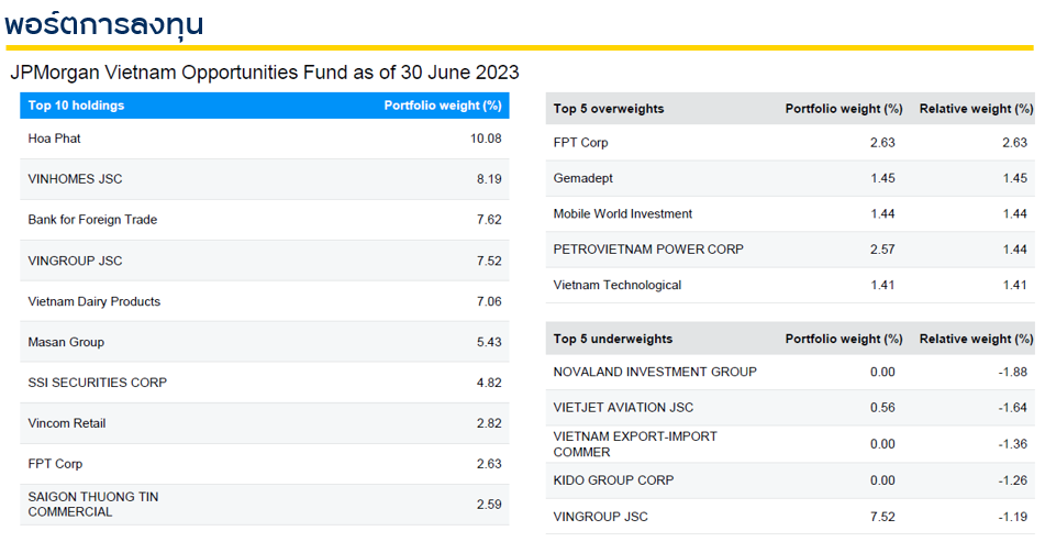ปัจจุบัน พอร์ตการลงทุนในตลาดหุ้นเวียดนาม ประกอบด้วยหุ้นที่เด่นๆ ออกมาและลงทุนใน 20 ถึง 30 บริษัทโดยหุ้นเด่นๆ ที่อยู่ในพอร์ตการลงทุนได้แก่ บริษัท FPT Corporation บริษัทเทคโนโลยีที่ใหญ่สุดในเวียดนาม บริษัท MWG หรือ Mobile World Investment Corporation ผู้นำธุรกิจค้าปลีกและจัดจำหน่ายสินค้าอิเล็กทรอนิกส์ที่ใหญ่ที่สุดในเวียดนาม และบริษัท Gemadept บริษัทโลจิสติกส์ชั้นนำของเวียดนาม เป็นต้น ด้วยวิธีการคัดหุ้นนี้ทำให้ JP Morgan สามารถทำผลตอบแทนชนะตลาดได้เป็นอย่างดี ที่มา: J.P. Morgan Asset Management ณ 30 มิ.ย. 66. | ดัชนีชี้วัด คือ MSCI Vietnam IMI Capped Index ในรูปสกุลเงิน USD | พอร์ตการลงทุนและการกระจายการลงทุนอาจมีการเปลี่ยนแปลงได้ตามดุลยพินิจของผู้จัดการกองทุน