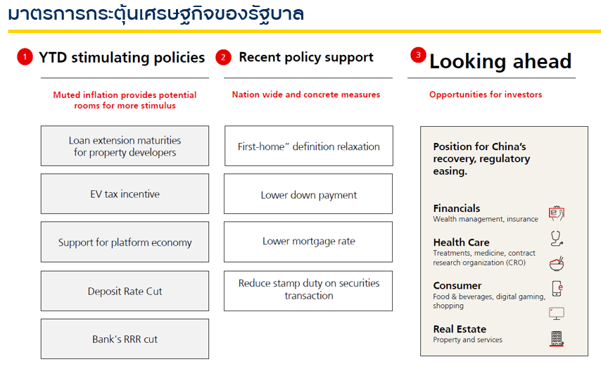 ด้านตลาดหุ้นจีน แม้บรรยากาศการลงทุนในปัจจุบันอาจดูไม่ดีนักและยังมีความผันผวนสูง แต่ UBS Asset Management ผู้เชี่ยวชาญการลงทุนหุ้นจีน เชื่อว่าตลาดใกล้จะถึงจุดต่ำสุดในไม่ช้าเนื่องจากมีสัญญาณหลายอย่างที่มีแนวโน้มไปในทิศทางที่ดีขึ้น การบริโภคเพิ่มมากขึ้น ภาคการท่องเที่ยวฟื้นตัวดีขึ้น คนจีนมีการเดินทางเที่ยวภายในประเทศเพิ่มมากขึ้นทำให้เกิดการกระตุ้นทางเศรษฐกิจ นอกจากนี้มีตัวเลข PMI ที่ดีขึ้น สะท้อนให้เห็นว่าภาคการผลิตเริ่มฟื้นตัว เชื่อว่าในไตรมาส 3 และ 4 ตลาดจีนน่าจะมีข่าวดีจากมาตรการกระตุ้นเศรษฐกิจของรัฐบาล เมื่อใดที่มีมาตรการกระตุ้นเศรษฐกิจออกมาทำให้คนมีความเชื่อมั่นมากขึ้นจะทำให้ตลาดหุ้นกลับมาฟื้นตัวได้อย่างรวดเร็ว ที่มา: UBS Asset Management ณ 31 ส.ค. 66