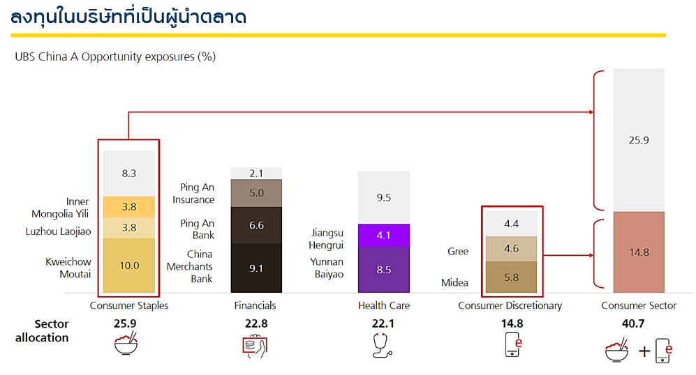 สำหรับกลยุทธ์การคัดเลือกหุ้นเพื่อเข้าลงทุนในตลาดหุ้นจีนนั้น กองทุนมองหาบริษัทที่ทำกำไรได้สูงแม้ในช่วงที่ตลาดยังไม่สดใสมากนัก อย่างเช่นหุ้นบริษัท Kweichow Maotai ผู้ผลิตสุราแบรนด์พรีเมี่ยมของจีนซึ่งมียอดขายที่เติบโตได้อย่างแข็งแกร่ง หรือเป็นมีโอกาสเติบโตขยายตลาดไปทั่วโลก เช่น บริษัท NetEase ผู้เล่นระดับโลกทางด้านเกมออนไลน์ รวมทั้งบริษัทที่มีโอกาสจะเป็นผู้นำตลาดในอนาคต ทั้งนี้ปัจจุบันกองทุนให้น้ำหนักการลงทุนในภาคการบริโภคที่เป็นสินค้าพรีเมียม ค้าปลีก หรือภาคการเงินอย่าง ธนาคารและประกันภัย และธุรกิจ Healthcare โดยเลือกบริษ้ทที่มีนวัตกรรมจาก R&D ของตัวเอง เป็นต้น ที่มา: UBS Asset Management ณ 31 ส.ค. 66