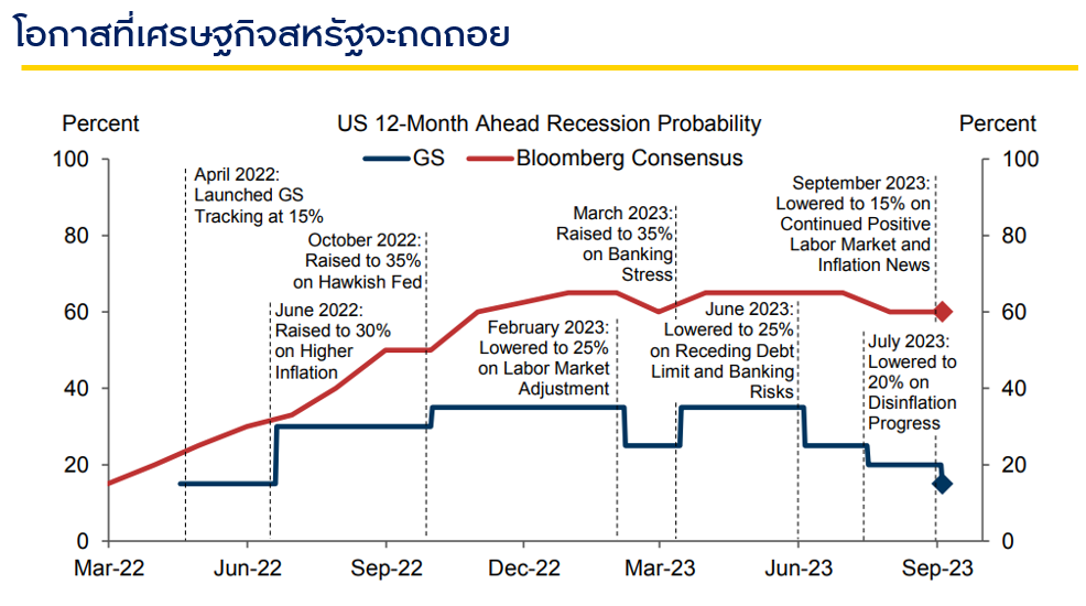 คุณเกียรติศักดิ์ กล่าวว่า ภาวะการลงทุนในช่วงที่ผ่านมา ตลาดค่อนข้างมีความผันผวนโดยเฉพาะจากประเด็นการขึ้นดอกเบี้ยของธนาคารกลางสหรัฐ (FED) เพื่อสกัดเงินเฟ้อและความกังวลเรื่องเศรษฐกิจถดถอย ตลาดจึงมีการปรับฐานค่อนข้างแรง แต่จากตัวเลขทางเศรษฐกิจล่าสุดของ Bloomberg Consensus ชี้ให้เห็นอัตราการว่างงานที่ลดลง เงินเฟ้อลดลงอย่างต่อเนื่อง ทำให้ FED มีแนวโน้มที่อาจจะหยุดการขึ้นดอกเบี้ย ทั้งยังมีการปรับตัวเลข GDP เพิ่มขึ้นจาก 1% เป็น 2.1% และผลประกอบการที่ดีขึ้นตั้งแต่ต้นปี ทำให้เชื่อว่าเศรษฐกิจจะไม่เข้าสู่สภาวะถดถอยอย่างที่คาดการณ์ไว้ก่อนหน้านี้ และตลาดหุ้นได้ตอบรับข่าวร้ายเหล่านี้ไปค่อนข้างมากแล้ว เชื่อว่าหลังจากนี้การลงทุนจะเริ่มมีทิศทางที่ดีขึ้น และตลาดไม่น่าจะปรับการปรับฐานหนักๆ เหมือนช่วงที่ผ่านมา จึงเป็นโอกาสที่ดีสำหรับการลงทุน ที่มา: Bloomberg, Goldman Sachs Global Investment Research ณ 6 ก.ย. 66