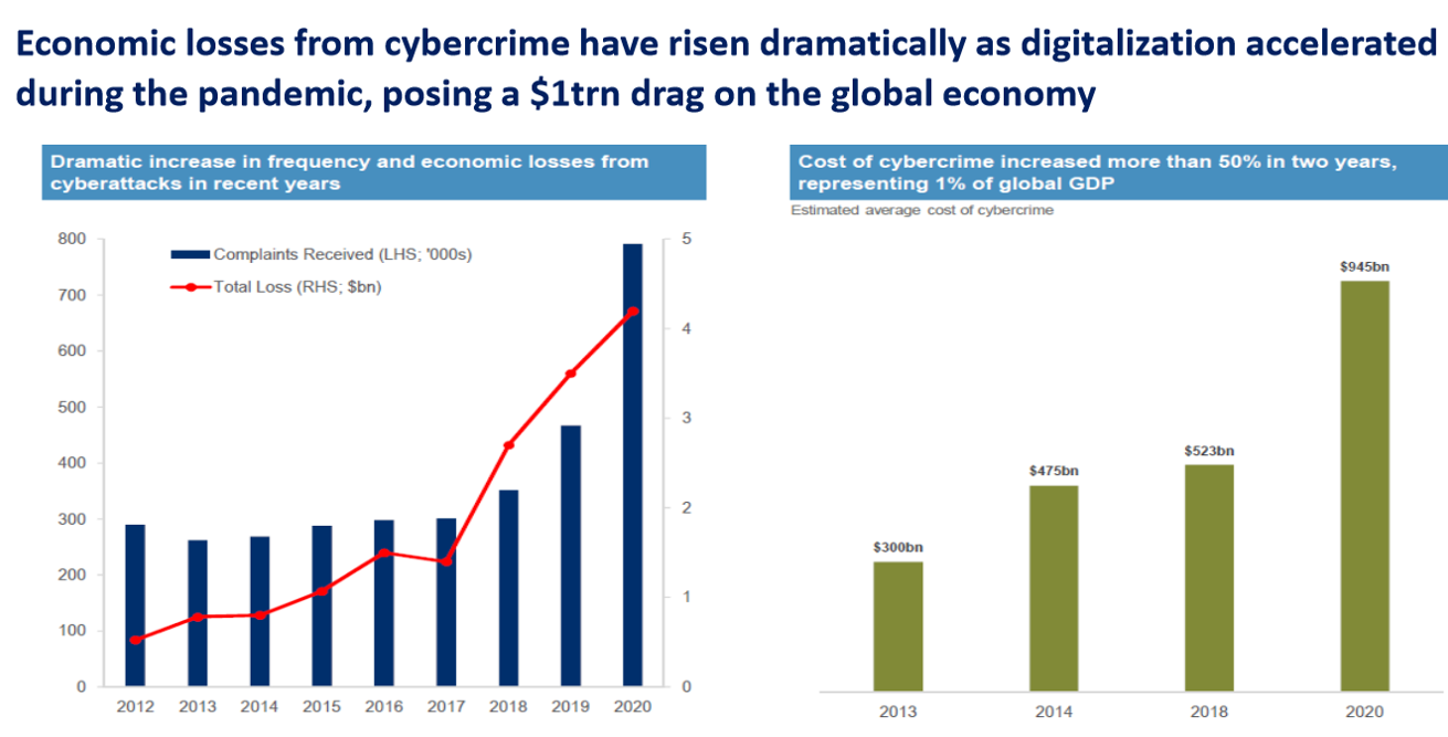 ที่มา: J.P. Morgan, FBI IC3 Internet Crime Annual Reports (LHS), CSIS "The Hidden Costs of Cybercrime“ (RHS), ก.ย. 2564
