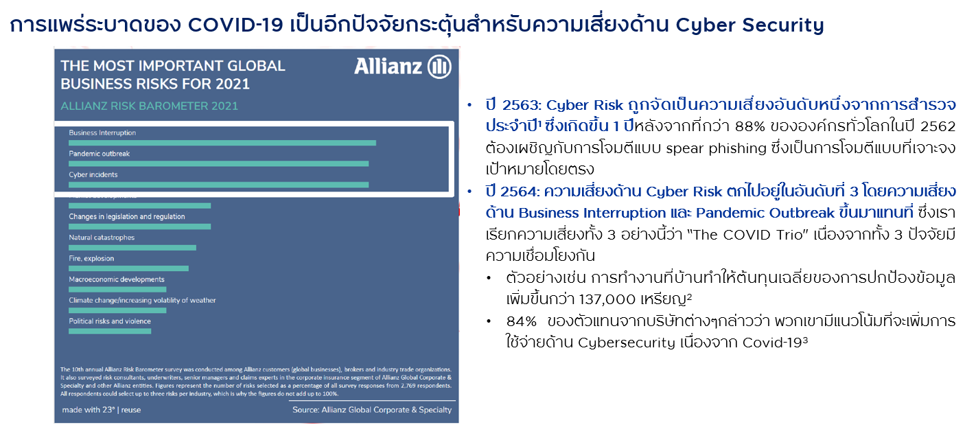 ที่มา: 1Allianz Risk Monitor – Identifying the mayor business risks for 2021 ข้อมูลอ้างอิงจากการสอบถามพนักงานระดับผู้จัดการจำนวน 2,769 รายจาก 92 ประเทศ และ 22 กลุ่มอุตสาหกรรมเกี่ยวกับมุมมองของความเสี่ยงในด้านต่างๆ | 2varonis: 134 Cybersecurity Statistics and Trends for 2021 ณ ก.พ. 64 | 3worldwide; HfS Research ณ เม.ย. 63 โดยมีผู้ตอบแบบสอบถามออนไลน์ที่เป็นตัวแทนจากผู้ประกอบการหลัก ซึ่งมีอายุ 18 ปีขึ้นไป จำนวน 631 ราย