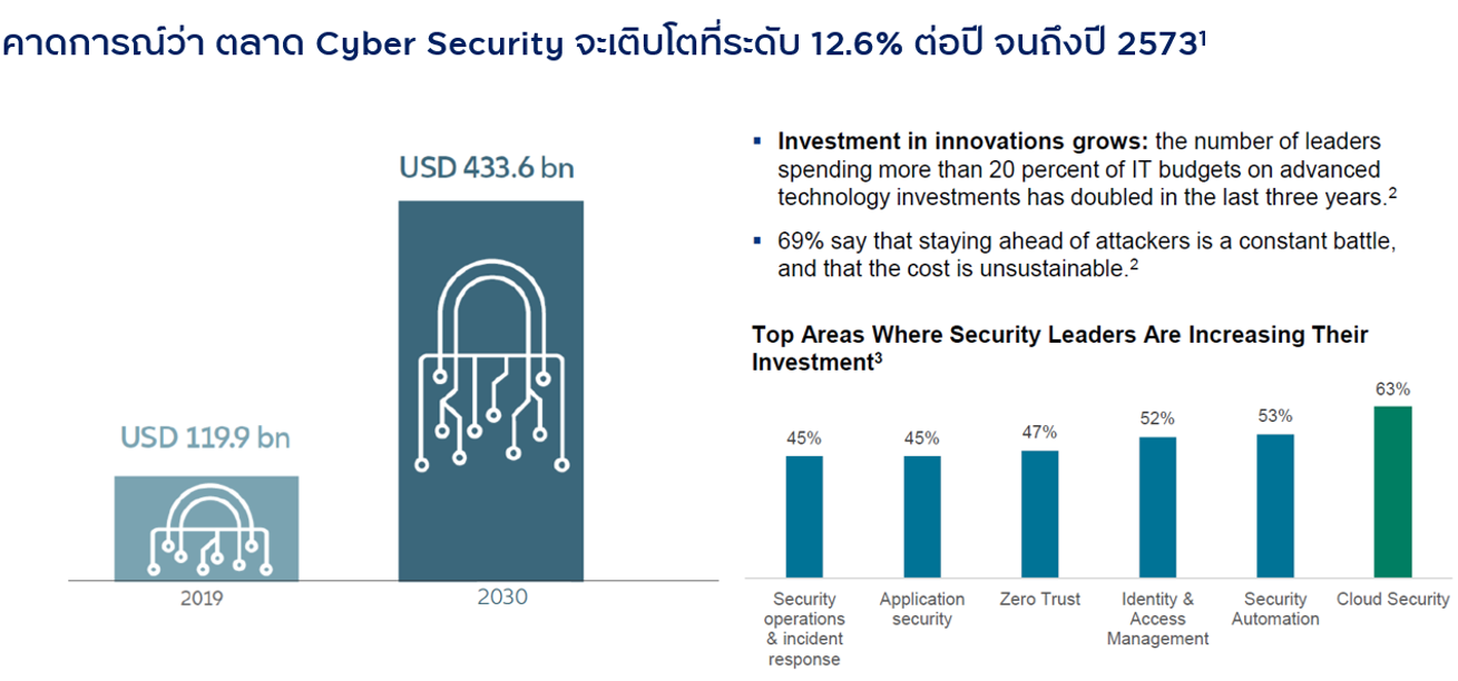 อย่างไรก็ตาม คุณเกียรติศักดิ์กล่าวว่า ในปัจจุบัน การลงทุนในระบบป้องกันภัยนั้นยังอยู่ในระดับที่ค่อนข้างต่ำ เพียง 1% ของการลงทุนในระบบ IT ขององค์กรเท่านั้น ซึ่งยังไม่เพียงพอต่อการเพิ่มประสิทธิภาพในการป้องกัน ทั้งนี้ ค่าใช้จ่ายในการเสริมระบบความปลอดภัยทางไซเบอร์ที่เหมาะสมสำหรับองค์กรควรจะเพิ่มขึ้นเป็น 5 - 10% จึงจะเพียงพอ และด้วยความจำเป็นที่องค์กรต้องเสริมสร้างระบบป้องกันภัยทางไซเบอร์ จึงคาดว่าตลาดนี้จะสามารถเติบโตที่ระดับ 12% ต่อปีไปจนถึงปี 2573 การเติบโตอย่างมีนัยยะเช่นนี้จึงเป็นโอกาสที่เปิดกว้างสำหรับการลงทุน ซึ่งนักวิเคราะห์ทั่วโลกได้มีการปรับเพิ่มประมาณการการเติบโตของรายได้และผลกำไรของหุ้นกลุ่ม Cyber Security ในปลายปีนี้ ว่ามี Upside มากถึง 41% ซึ่งถือว่าสูงมากสำหรับหุ้นกลุ่มเทคโนโลยีที่ยังมีความเสี่ยงจากอัตราดอกเบี้ย และเงินเฟ้อที่จะทำให้ต้นทุนสูงขึ้น