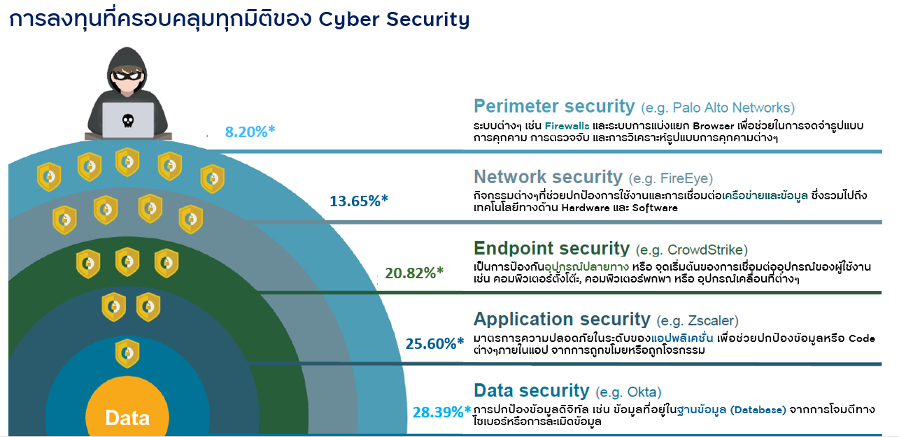 ทั้งนี้ คุณ Johannes ได้อธิบายถึงธุรกิจประเภทต่างๆที่เกี่ยวข้องกับ Cyber Security ว่าสามารถแยกย่อยออกเป็นประเภทต่างๆ ตามความถนัดและความเชี่ยวชาญของแต่ละบริษัท ได้แก่ Perimeter Security เช่นระบบ firewall ที่ป้องกันการจู่โจมจากภายนอก, Network Security ระบบป้องกันภัยทางเน็ตเวิร์ค, Endpoint Security ระบบป้องกันอุปกรณ์ปลายทาง, Application Security ระบบป้องกันด้วยแอพพลิเคชั่น และ Data Security ระบบการป้องกันข้อมูลจากการโจมตีจากภายนอก ซึ่งกองทุนจะคัดเลือกสินทรัพย์ที่มีเทคโนโลยีที่ก้าวหน้าแบบ Next Gen ใช้ AI ตรวจสอบพฤติกรรมแบบเชิงรุก สามารถป้องกันการจู่โจมได้อย่างรวดเร็ว มีศักยภาพเติบโตและเป็นผู้นำที่มีส่วนแบ่งตลาดสูงสุดในตลาดประเภทนั้นๆ และจะกระจายการลงทุนใน 30 - 60 หลักทรัพย์ เน้นหนักในหุ้นเติบโตขนาดกลางและเล็ก และลดความเสี่ยงโดยกระจายในหุ้นขนาดใหญ่ด้วย