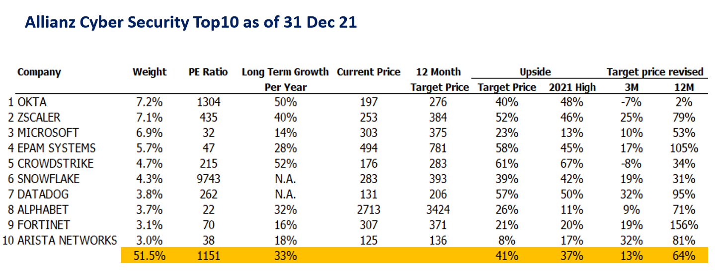 คุณเกียรติศักดิ์กล่าวว่า ใน 3 ปีที่ผ่านมา หุ้นกลุ่ม Cyber Security มีอัตราการเติบโตของรายได้อยู่ที่ประมาณ 20 - 30% ต่อปี (ที่มา: Allianz Global Investors ณ 31 ธ.ค. 2564) ส่วนอัตราการเติบโตของผลกำไรหุ้นกลุ่ม Cyber Security ในอีก 3 - 5 ปีข้างหน้าของหุ้น 10 อันดับแรกของพอร์ตการลงทุน คาดการณ์อยู่ที่ 33% ขณะที่การเติบโตในระยะยาวอยู่ที่ 13 - 15% ต่อปี นอกจากนี้ หากเปรียบเทียบราคาปัจจุบันกับราคาคาดการณ์ในช่วง 1 ปีข้างหน้าของนักวิเคราะห์ พบว่าหุ้นกลุ่มนี้ยังมี Upside มากถึง 41%