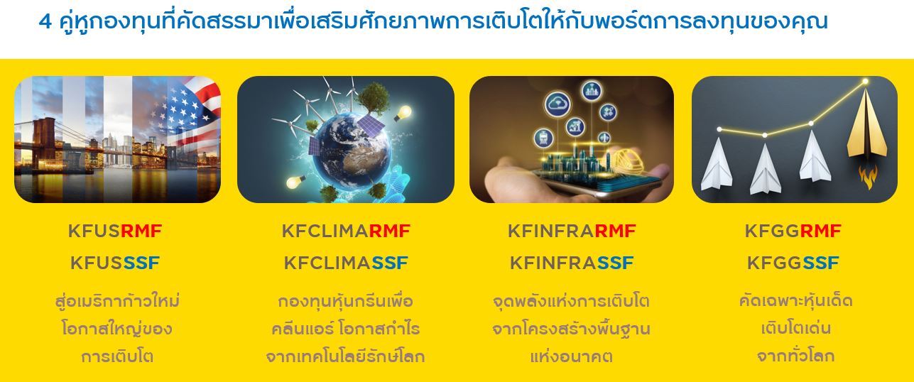 สำหรับผู้ที่รับความผันผวนได้น้อยกว่าก็ยังมีอีกสองทางเลือก คือ KFCLIMARMF/ KFCLIMASSF และ KFINFRARMF/ KFINFRASSF ซึ่งทั้งสองคู่กองทุนนี้จะลงทุนในธุรกิจที่มีโอกาสเติบโตจากการที่ได้รับการสนับสนุนเชิงนโยบายจากรัฐบาล