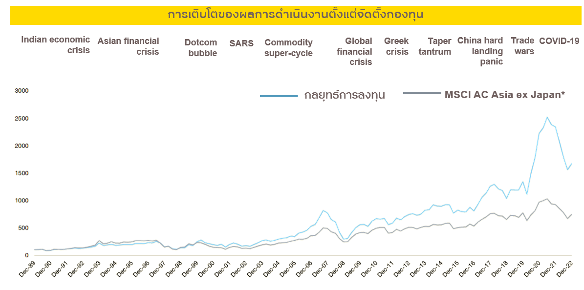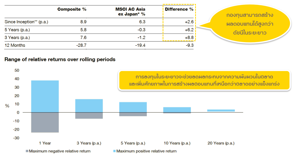 ผลการดำเนินงานของกองทุนหลัก ที่มา: StatePro, MSCI, Baillie Gifford & Co ณ 31 ธ.ค. 65 | ผลการดำเนินงานที่แสดงเป็นผลการดำเนินงานของกองทุนหลัก ซึ่งไม่ได้เป็นไปตามมาตรฐานการวัดผลการดำเนินงานของกองทุนรวมของสมาคมบริษัทจัดการลงทุน | *กองทุนใช้ดัชนี้ MSCI AC Far East ex Japan จนถึง 31 ม.ค. 54 | **วันจัดตั้งกองทุนคือ 31 ธ.ค. 32 | ค่าที่แสดงอาจมีการปัดเศษ | ผลตอบแทนเปรียบเทียบ (Relative returns) เป็นผลตอบแทนสะสมรายเดือนเฉลี่ยต่อปี ตั้งแต่ 31 ธ.ค. 32 – 31 ธ.ค. 65 เปรียบเทียบกับดัชนี MSCI Asia ex Japan (ก่อนหน้าวันที่ 31 ม.ค. 54 อ้างอิงจากดัชนี MSCI AC Far East ex Japan)
