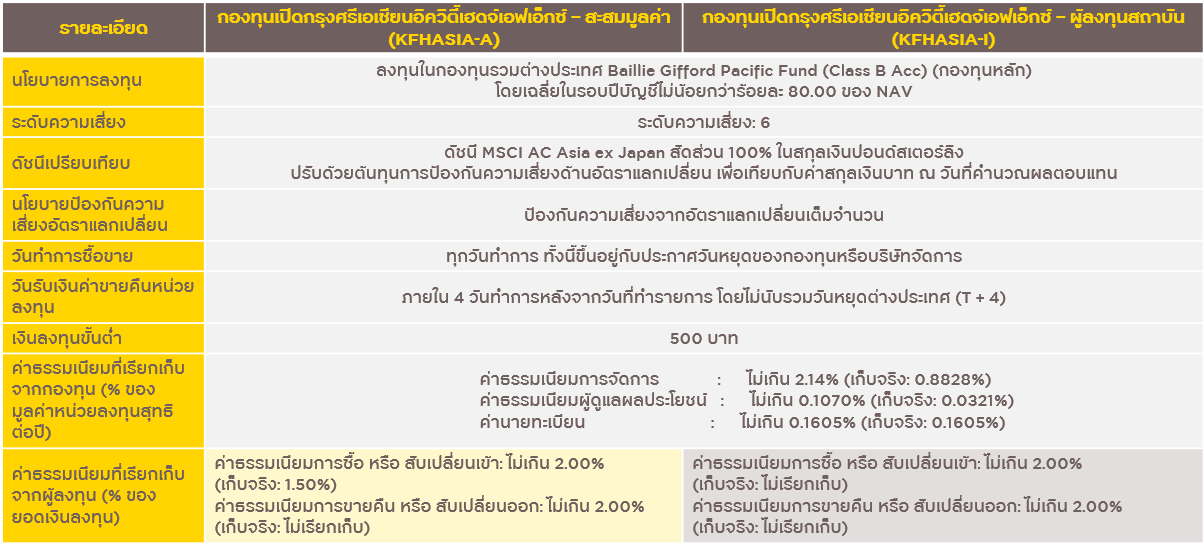 รายละเอียดกองทุน KFHASIA-A หมายเหตุ : ค่าธรรมเนียมที่เรียกเก็บจากกองทุน และ/หรือผู้ลงทุนเป็นอัตราที่รวมภาษีมูลค่าเพิ่มหรือภาษีธุรกิจเฉพาะหรือภาษีอื่นใดแล้ว •ยกเว้นค่าธรรมเนียมการสับเปลี่ยนระหว่างชนิดหน่วยลงทุน